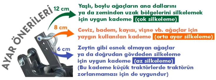 Çelik halat ne kadar kısa ve hafif tercih edilirse silkeleme başarısı artar. Halat boyu uzadıkça halat bel vermeye başlayacağı için silkeleme performansını olumsuz yönde etkileyebilir. Makinenin halat boyunu dilediğiniz ölçüye kısaltabilirsiniz. Traktörün hasat edilen mahsülü ezmeyeceği halat boyu yeterlidir. Bu boy, genç ağaçlarda 4-6 metre yaşlı ağaçlarda ise 8-10 metrelere çıkabilmektedir.